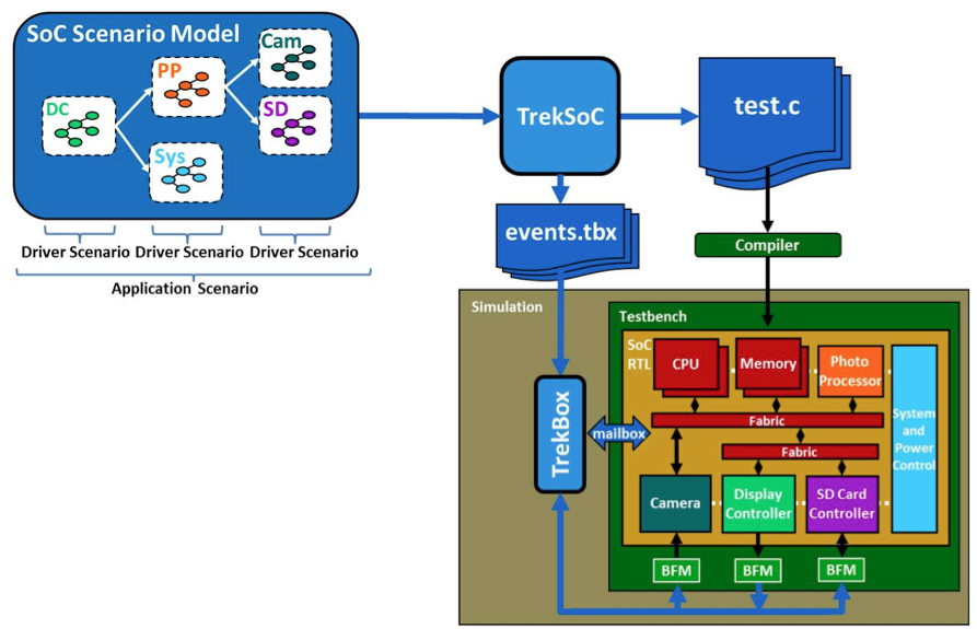 The generator also produces an “events” file that lists the actions to be performed by the TrekBox run-time component. When a test case needs to supply data on chip inputs, read and check data on chip outputs, or print a message in simulation, it sends an event ID via a memory-mapped mailbox. TrekBox looks up the ID in the events file and takes the appropriate action, including leveraging existing UVM VCs in the testbench. This solution allows complete end-to-end applications, such as the earlier examples for the digital camera, to run concurrently and stress-test every aspect of the SoC.