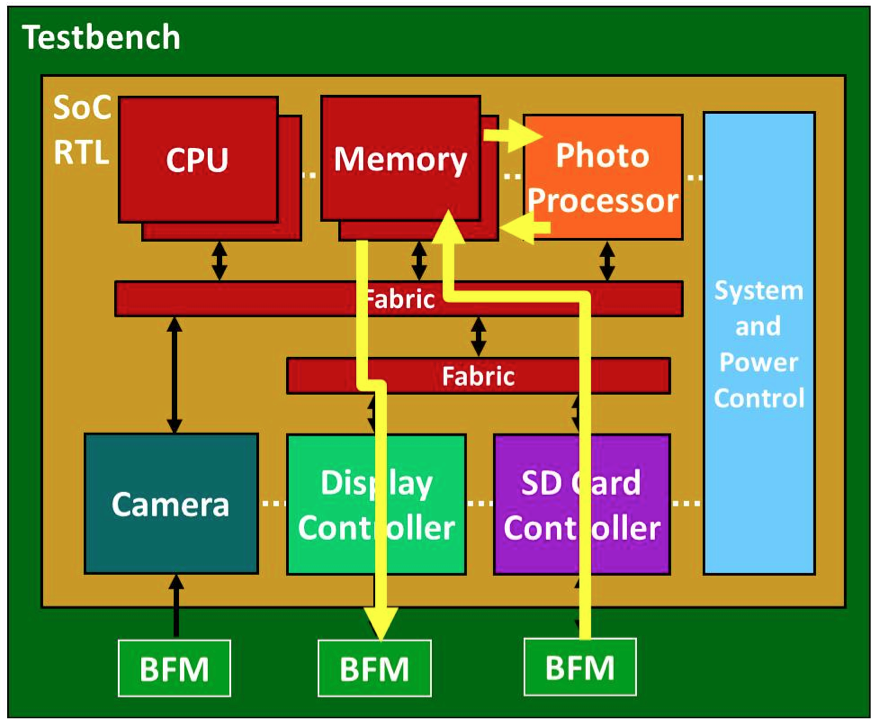However, there is no way that even the smartest software team can hand-write the level of tests needed to avoid the iceberg. Hand-written tests might, at best, exercise a single IP block in a driver-level scenario. In the case of the digital camera SoC, one test might verify that the display controller can read an image from memory and write it to a testbench model of the display. Another test might verify that the SD card controller can read an image from memory and write it to a testbench model of the SD card.