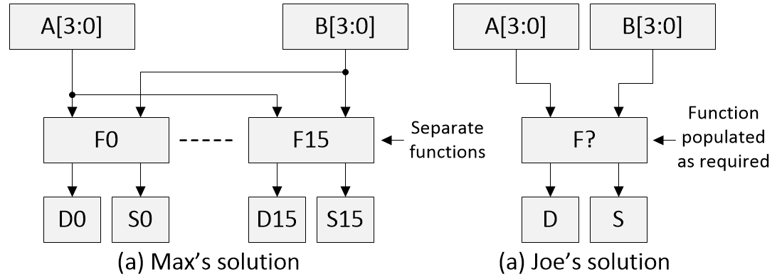 Joe’s solution has 12 inputs: A[3..0] and B[3..0] and F[3..0], and eight outputs: D[3..0] and S[3..0]. Thus, Joe’s solution could be implemented as a lookup table in a 4096-byte read-only memory.