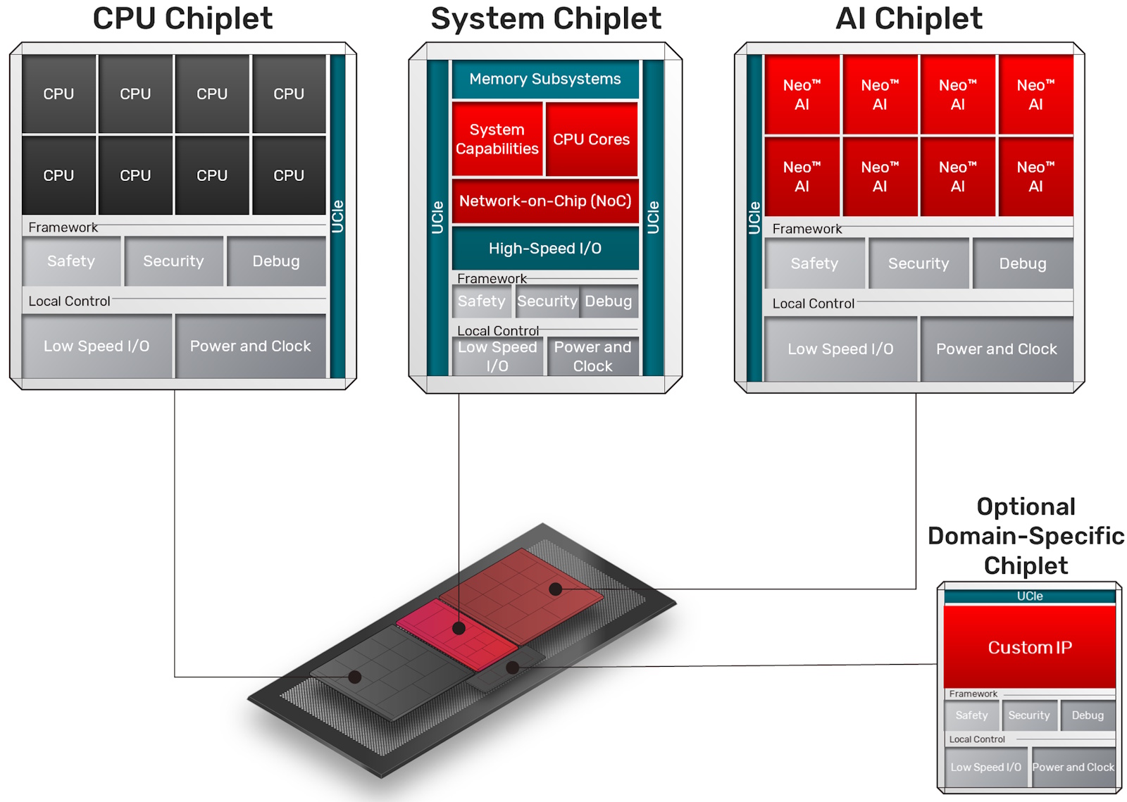 This framework-centric approach is intended to move the industry beyond proprietary multi-die implementations toward interoperable, standards-driven chiplet ecosystems while still allowing customers to customize domain-specific chiplets or scale compute and AI resources as needed.