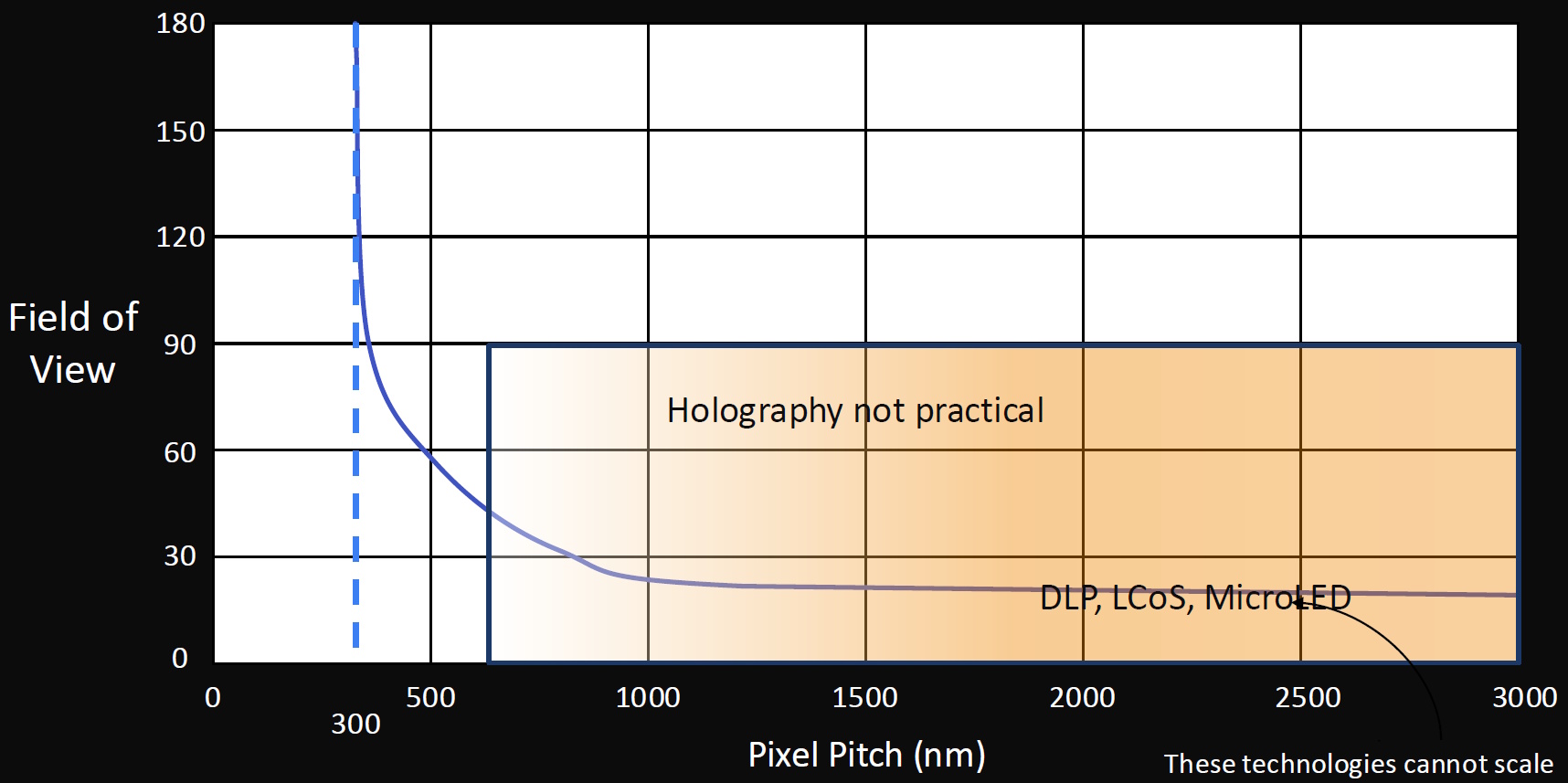 Mike tells me that true holography requires a pixel pitch that’s 1/2 the wavelength of the light being displayed, which means existing display technologies are an order of magnitude too large.