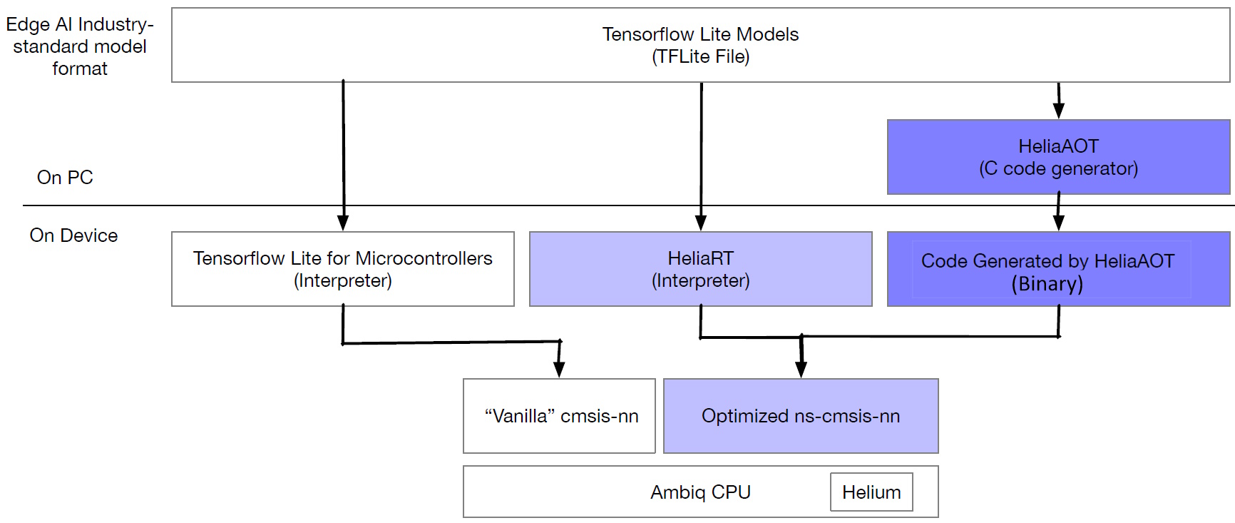 Let’s start with a traditional flow. At the “top” (well, at the top of the above diagram), we have an AI model in the industry-standard TensorFlow Lite (TFLite) format. At the “bottom,” we have the processor that will be executing the model—our Ambiq processor with Helium extensions, in this case.