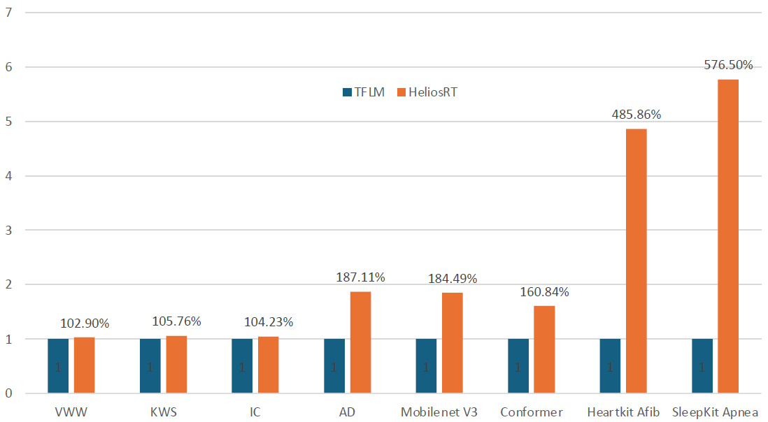 Consider the chart below. Each comparison is normalized to show the TFLM at 100%. Even in the case of industry-standard benchmarks (VWW, KWS, and IC), which everyone optimizes for, HeliaRT is ~2 to 5% faster, and this improvement increases to 500% or more in the case of real-world models.