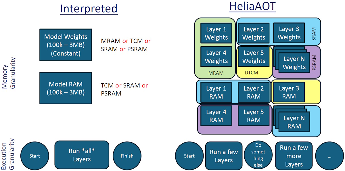 While we’re here, it would be remiss of us to neglect the concept of “granularity.” In fact, there are two aspects to this—memory granularity and execution granularity. Let’s start with memory. In the case of an embedded interpreted runtime, memory ends up being treated as two “big blobs” (I hope I’m not being too technical). That is, all the weights will be stored on one type of memory (be it MRAM, TCM, SRAM, or PSRAM). Similarly, all the model RAM will be stored in TCM, SRAM, or PSRAM. By comparison, in the case of HeliaAOT, you have the flexibility to put the weights and model memory associated with different layers in the most appropriate type of memory.