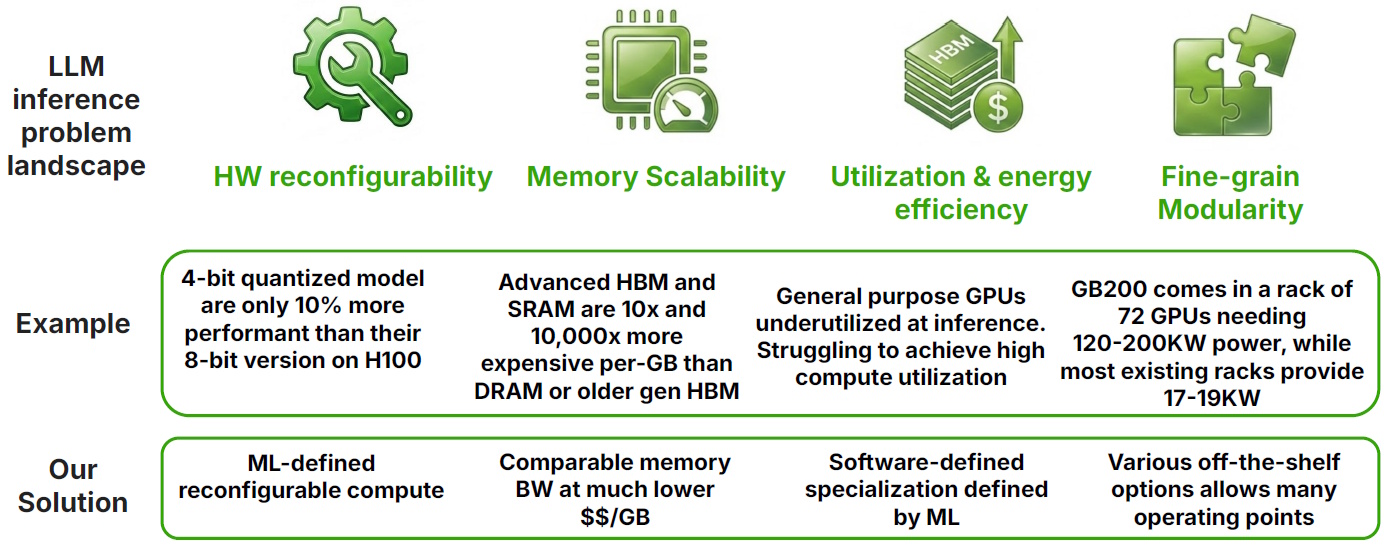 Third, we have utilization and energy efficiency. Modern GPUs are designed to handle everything from training to inference to graphics, but this generality comes at a cost. During inference, which is typically memory-bound, much of the available compute goes underutilized, while power requirements continue to climb (think racks consuming on the order of 120 to 200 kilowatts).