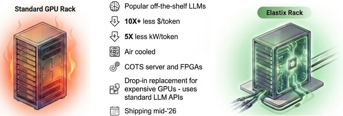 The Elastix solution sits neatly within the existing software stack, supporting familiar interfaces like the OpenAI API and frameworks such as vLLM, but swapping out the underlying NVIDIA/CUDA layer for an Elastix plugin and runtime.