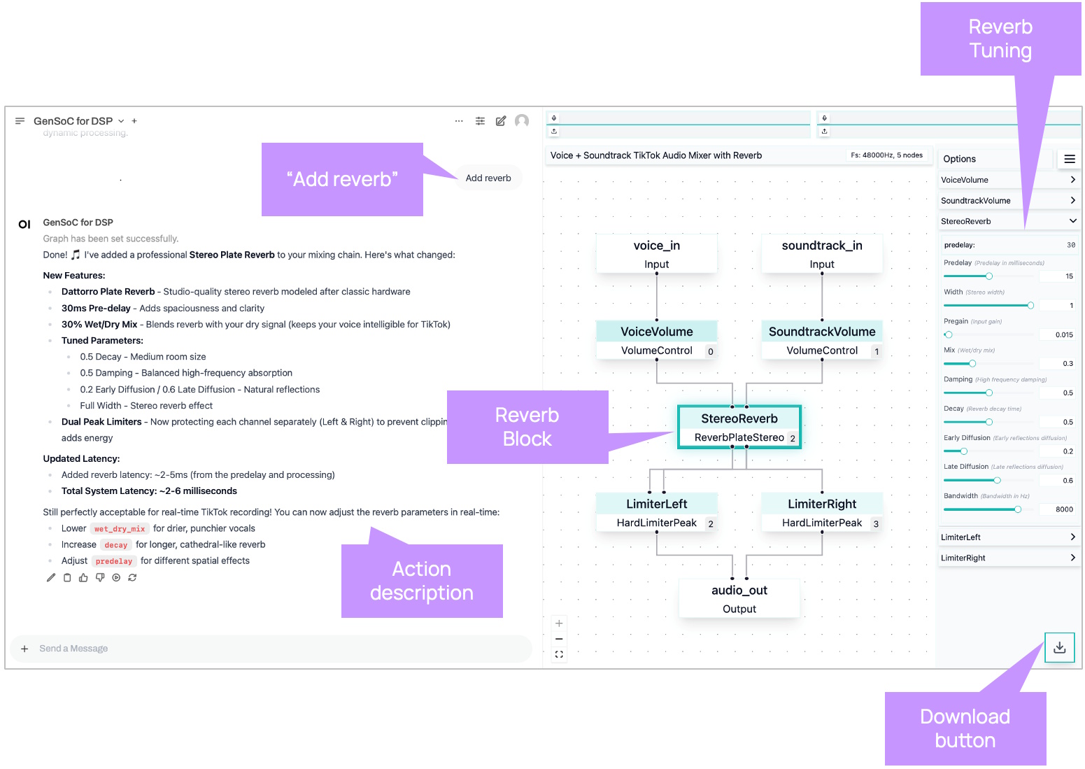 Crucially, this isn’t a one-shot trick. GenSoC supports iterative refinement in natural language. If you decide the design needs more functionality, you can simply say, “Add reverb, “ or “Add a noise-reduction stage,” or “Change this to a two-channel output,” and the system will update the design accordingly. The AI isn’t just emitting code; it’s continuously reasoning about timing, resource usage, and data flow as the system evolves.