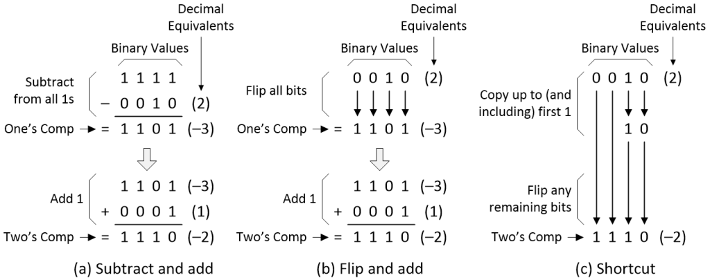 If we wish to represent both positive and negative numbers, then there are two commonly used approaches. The first, whose usage is relatively rare, is called sign-magnitude binary. This is shown as (b) in the diagram above. In this case, the most-significant bit (MSB), which is called the sign bit, is used to indicate positive and negative values (0 = positive, 1 = negative). The remaining bits, which have the same column weights as before, are used to represent the magnitude of the number. Using this scheme, we can represent values from –7 to +7. Although this approach is intuitive and balanced (it provides the same number of positive and negative values), it’s a bit “clunky” to use, not least that we end up with two flavors of zero (+0 and –0).