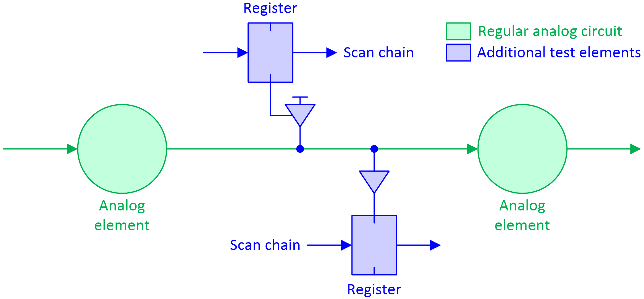 The regular analog circuit elements and wires are shown in green. The additional test elements and wires are shown in blue. Assume that the analog circuit is placed into some default static (unchanging) state. Now consider the buffer driving a signal onto the analog wire. Based on the 0 or 1 in its associated register element, this can be placed in a tristate condition, thereby having no effect on the circuit. Alternatively, it can be used to overdrive the value coming out of the analog element to a specified voltage. Only one register-buffer combo is shown here, but multiple such combos can be used to inject various voltage values onto the same node.