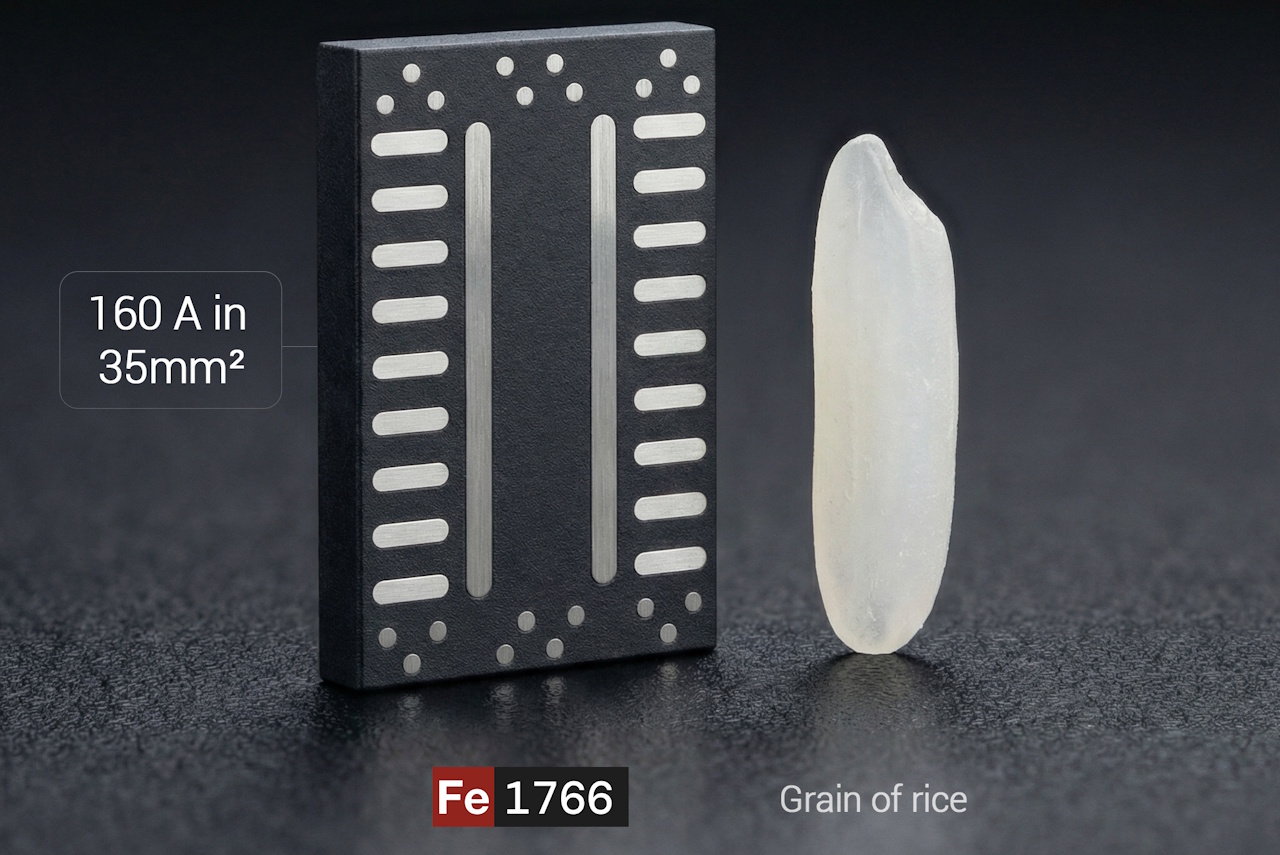 The image below shows an Fe1766 next to a grain of rice. Its 8mm x 4.4mm package, which is only a couple of hundred microns thick (about 2 to 3 human hairs), can deliver a whopping 160A sustained, and up to twice that amount for short durations.