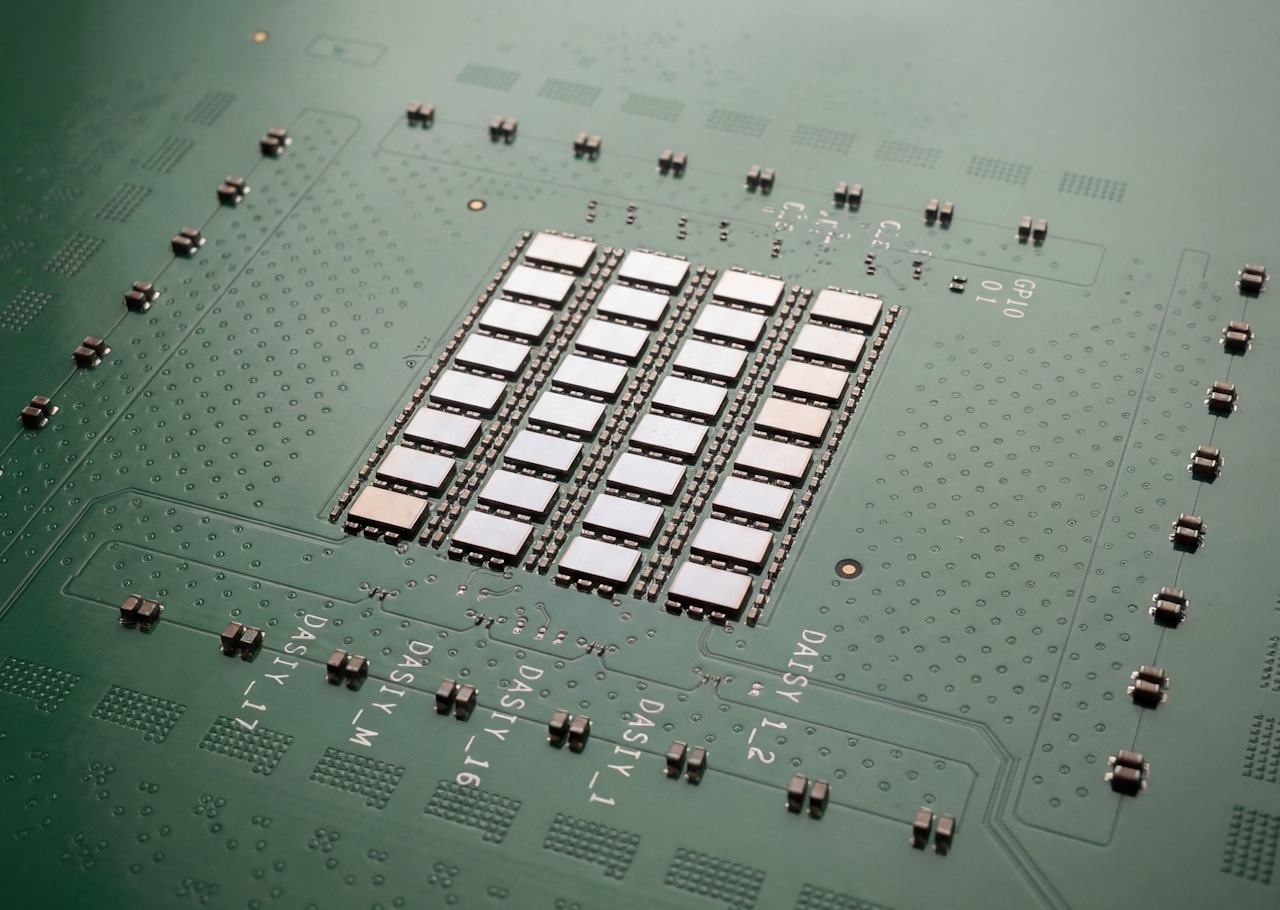 Importantly, these devices are not obliged to function in isolation. Fe1766-based solutions can scale up to >10kW by ganging up to 64 devices together. The image below shows an array of 32 IVRs mounted on the bottom of a board beneath a processor.
