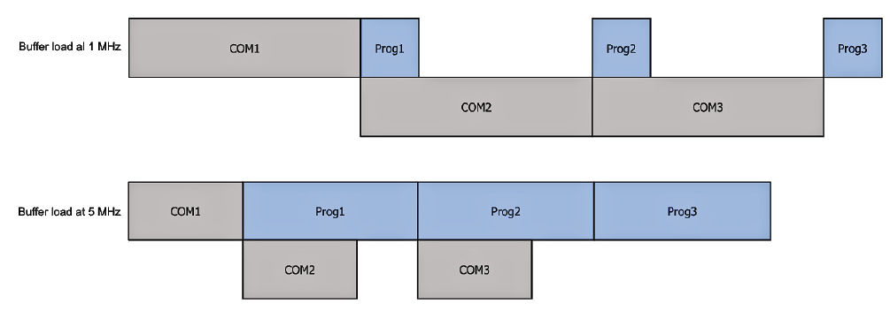 Depending on the SPI port’s clock rate, the ST M95P serial EEPROMs can fully overlap data transfers with page storage. At 1 MHz, data transfer takes longer than page programming. At 5 MHz, the two processes completely overlap. The maximum SPI clock rate for these serial EEPROMs is 80 MHz. When the SPI clock frequency is 80 MHz, communication over the SPI bus takes 4% of the total time. Image credit: ST Microelectronics