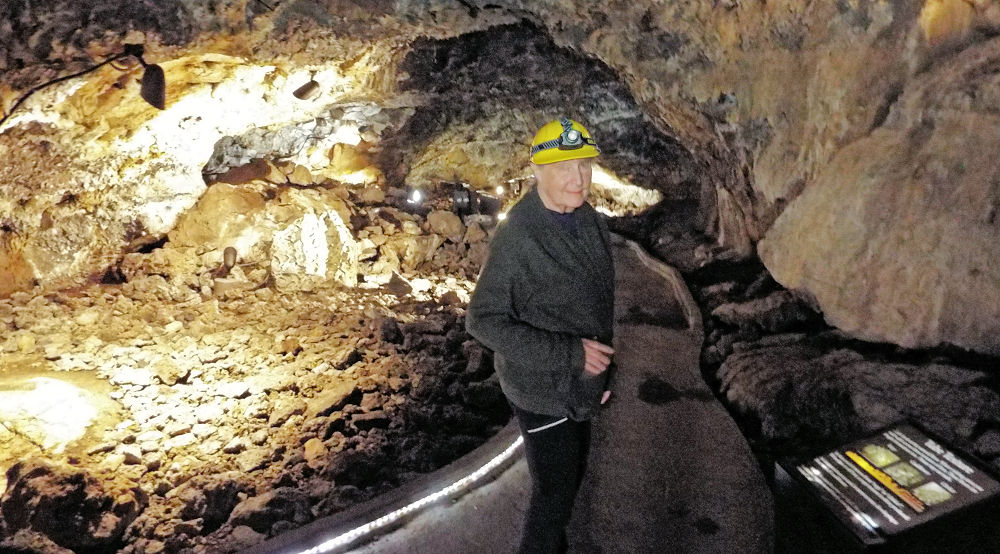 My wife Pat in a lava tube at the Lava Beds National Monument in California. Hard hats are mandatory. Image credit: Steve Leibson