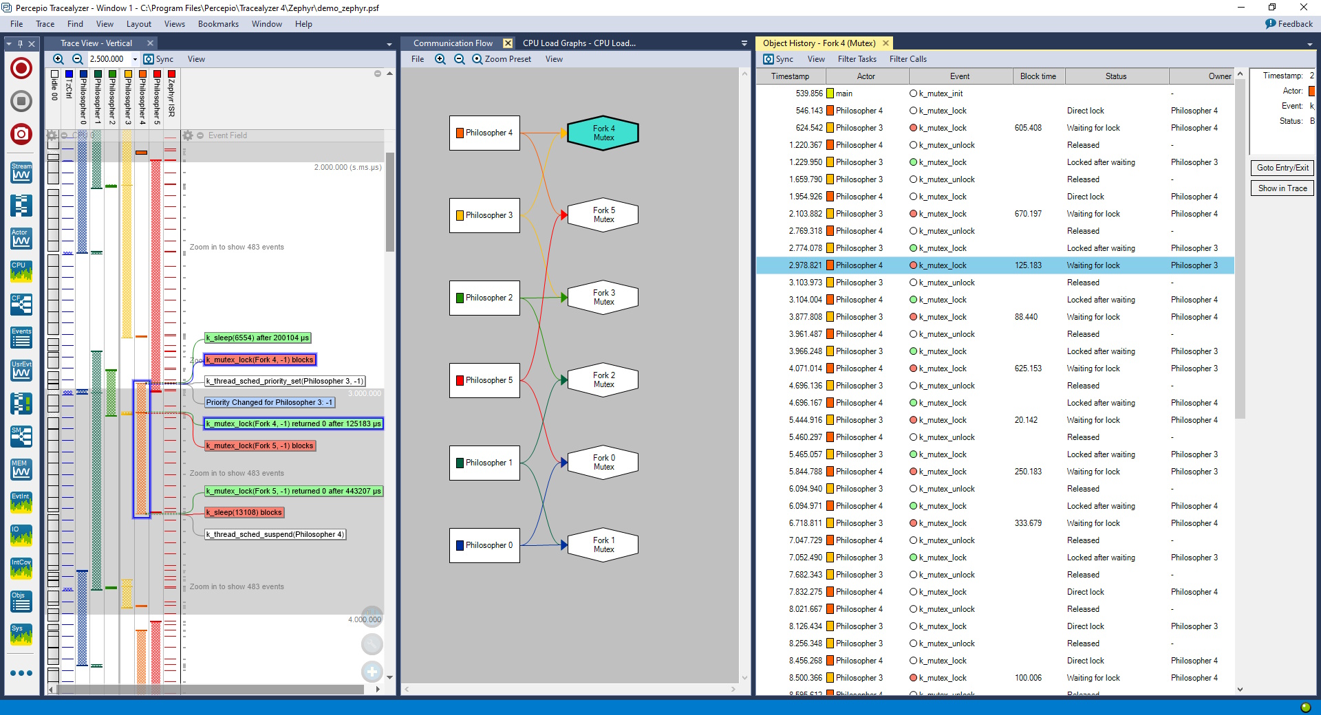 At a glance, you can see which philosopher (thread) is waiting on which fork (mutex). You can see priority changes, lock contention, and blocking times. And you can double-click on the abstracted graph and drill directly into the precise RTOS calls that led to a stall.