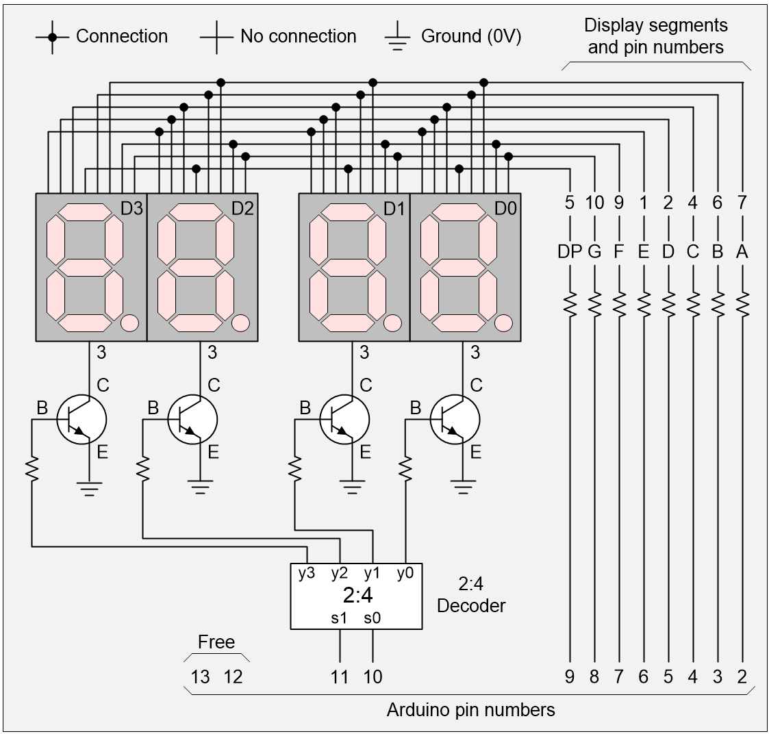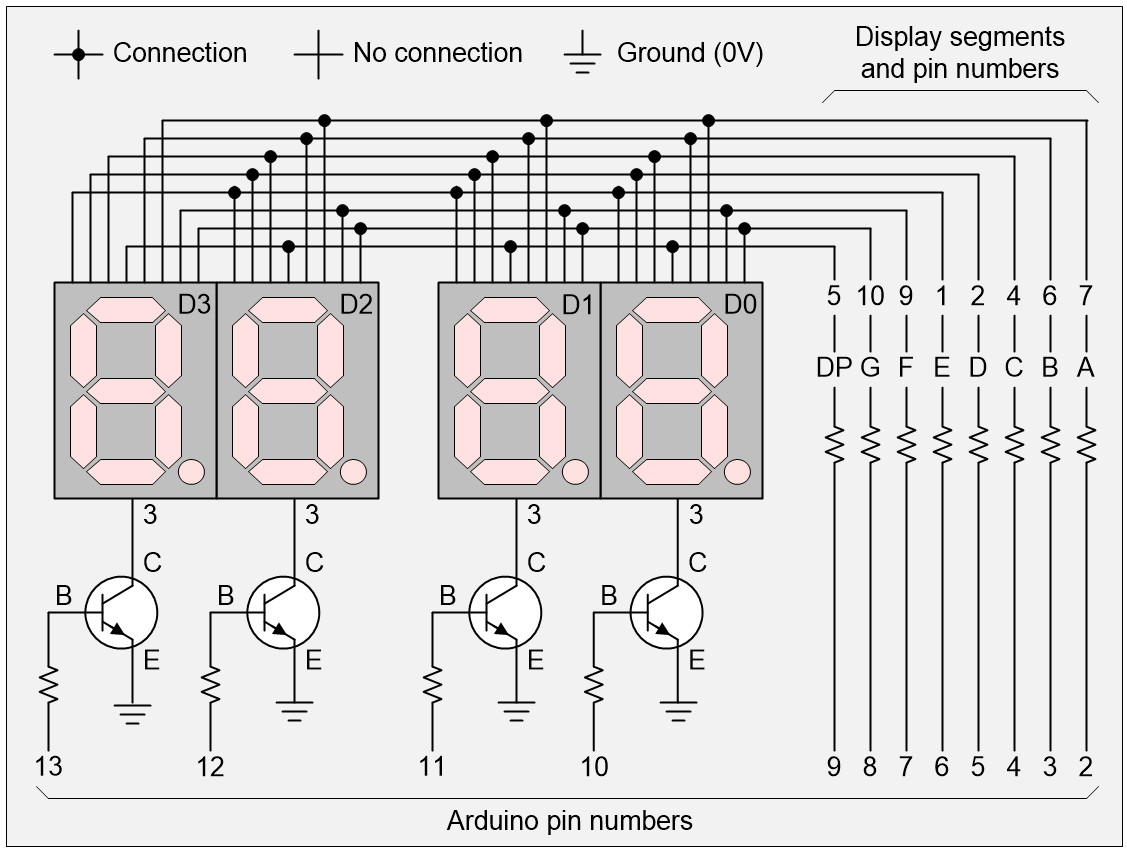 The idea is that we start by using the Arduino to turn all the transistors off. Then we set the required 0 and 1 values on the pins driving the segments. Then we turn one of the transistors on to activate its associated display. We display the value for a short time (say 1/1000 of a second), then we turn that transistor off again. We repeat the process with different values for the other three displays