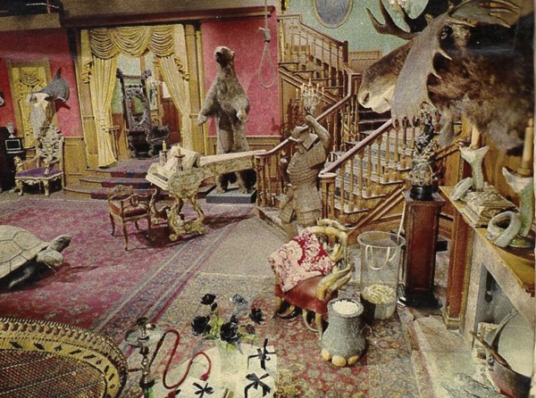 These are color photos from the set of the original Addams Family black-and-white television show that aired from 1964-1966. The photos were taken by Richard Fish (1919-2005).